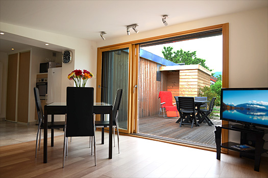 Charmante maisonnette indépendante, grand confort avec terrasse sud. Climatisation. Parking privé et clos dans un quartier résidentiel calme entre ville et lac. Cuisine toute équipée ( plaques induction, lave vaisselle, lave linge, etc...), ouverte sur une grande pièce à vivre, donnant sur la terrasse. Salle de bains avec douche et WC. A l'étage , une chambre avec un lit de 160 et un second WC indépendant.